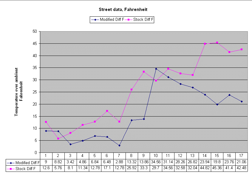 In general this chart reflects a complete success for the custom intake. In this chart the modified intake showed clear advantages over the stock intake. Even after allowed to heat soak in a parking lot for 15 minutes it quickly regained its composure and started to normalize the intake temperature. By the end of the 45 minute trip the difference between stock and custom was nearly 25 degrees! It's hard to say how high the stock intake might have gone if I had driven further while the modified intake was still going DOWN. If not for the stop at the store the graph would have been even more dramatic.