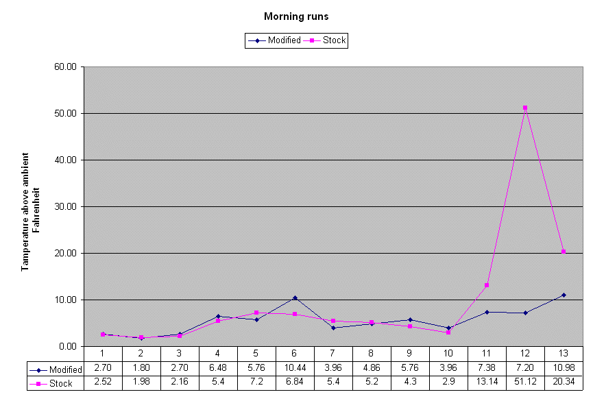 It's easy to see that differences in the intake temperatures are neglegible. Due to the nature of travel (few stops, little traffic) and the fact that the engine bay starts out stone cold in the morning, there is little opportunity for either the stock nor the modified intake to absorb enough heat to effect intake temperatures in the 30 minutes of time it takes me to get to work. The only possible benefit the modified intake may have had during this run is the increased breathing capacity due to removing the stock snorkle restriction.